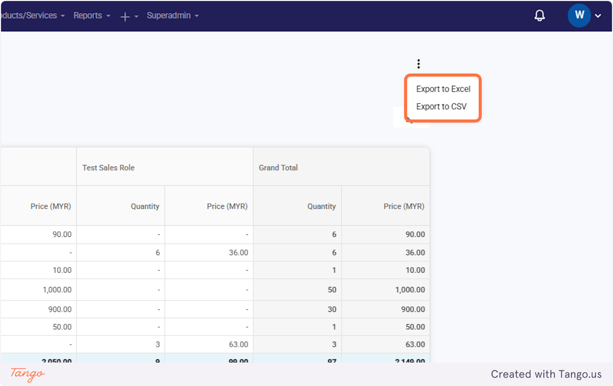 12. Choose to export the Sales Summary Report as an Excel or CSV file