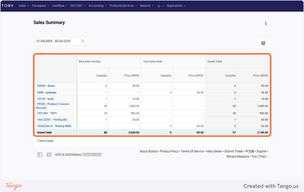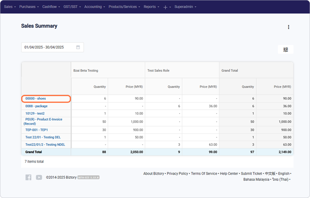 4. You can view the sales and quantities of each product by different salespersons within the selected period, along with the overall grand total.