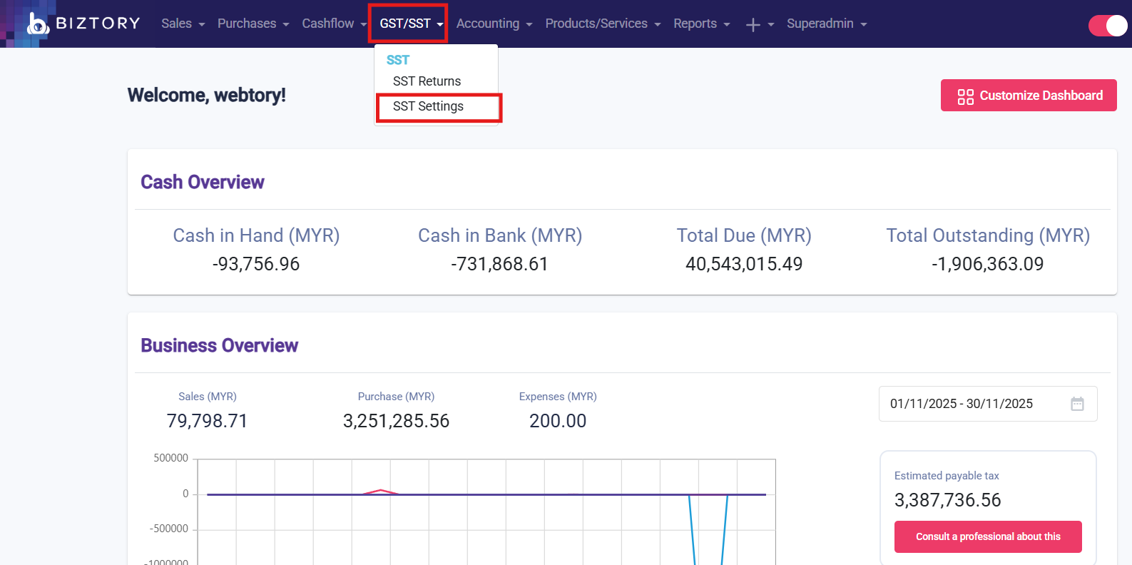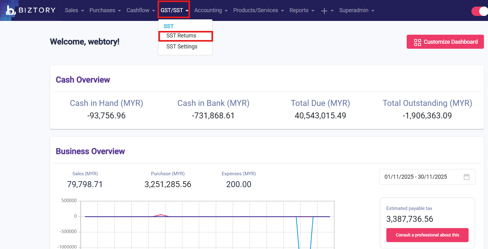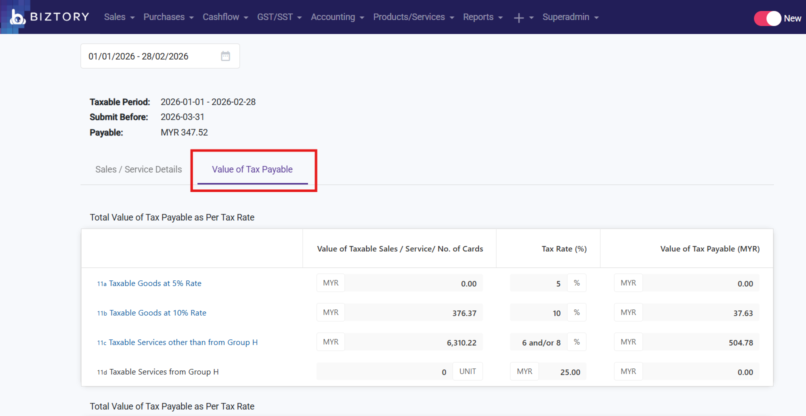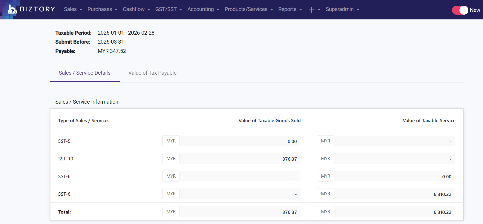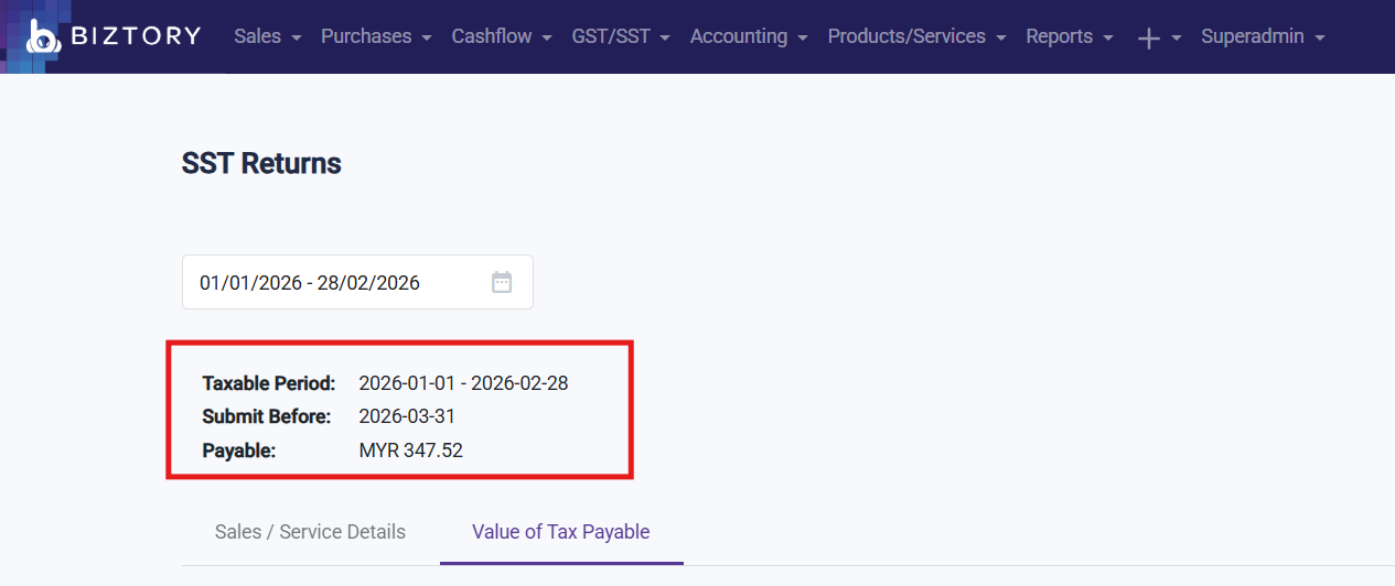 - When you want to submit the SST, you can come to the SST return report to check the submission date and amount that needs to be made.