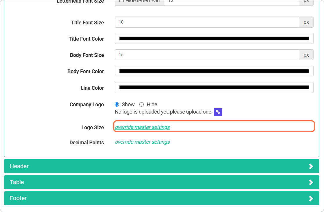 17. Click on 'Override Master Settings' to set your own settings for the Company Logo