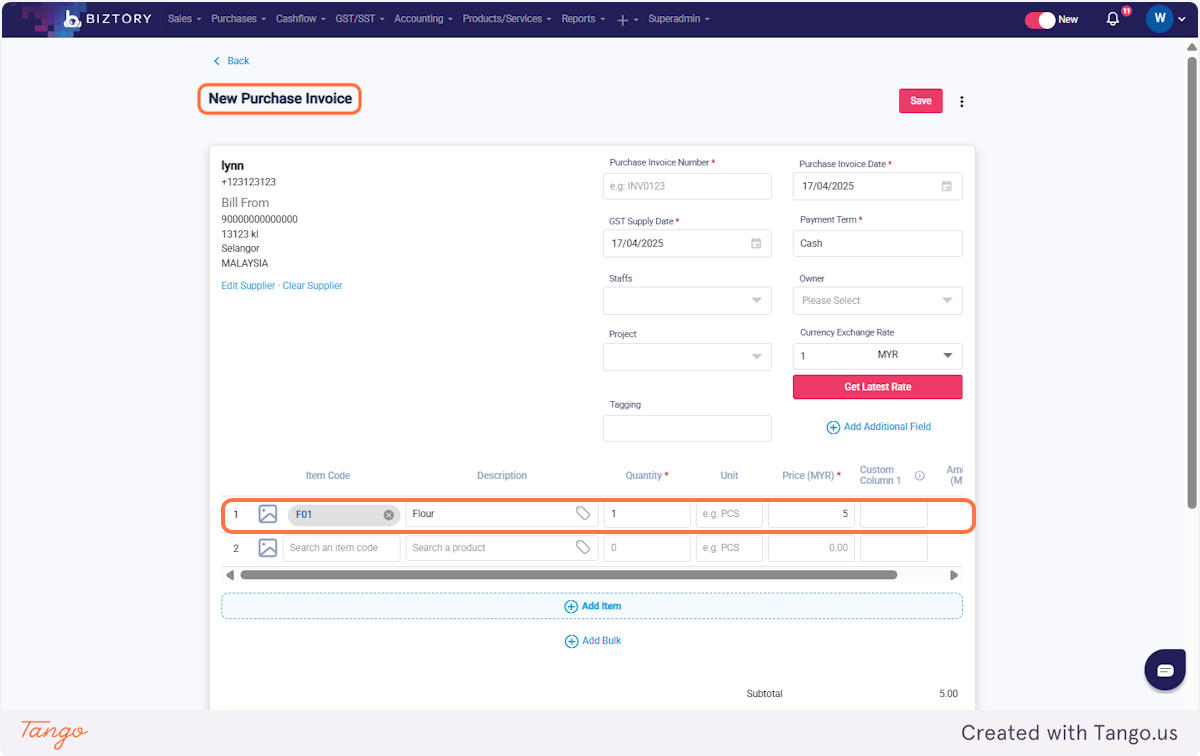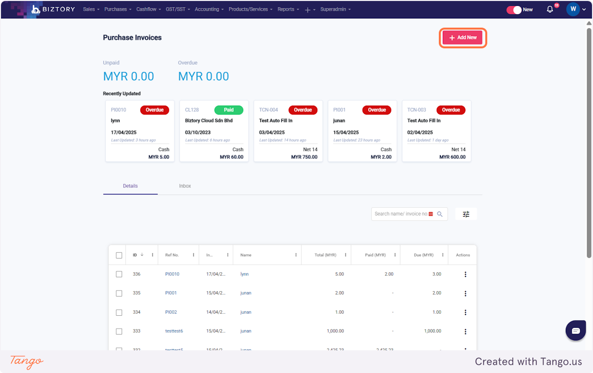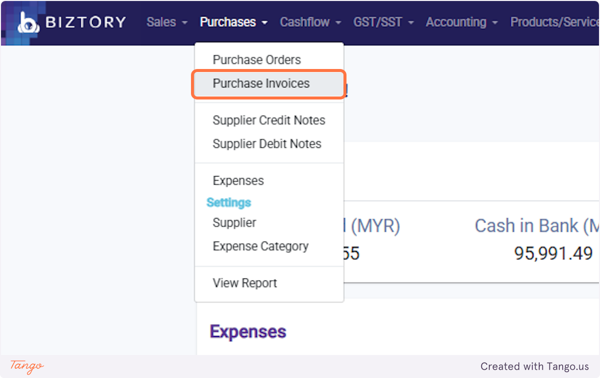 9. To buy the product, click on Purchases and select 'Purchase Invoices'