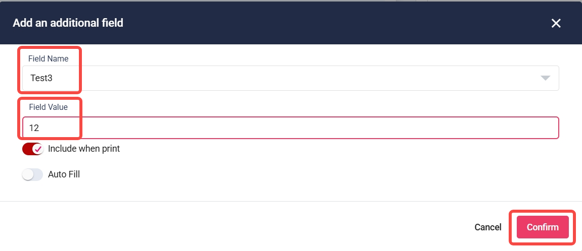 Toggle ‘Include when print’ to decide whether this field should appear on printed documents.