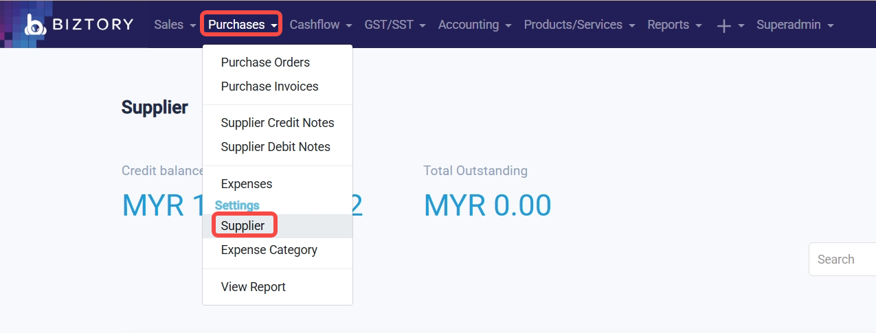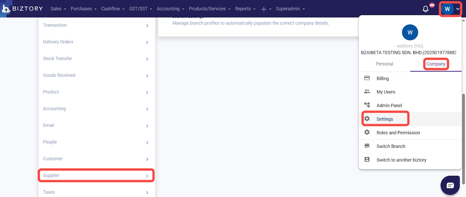 Go to Profile Icon > Company > Setting > Supplier.